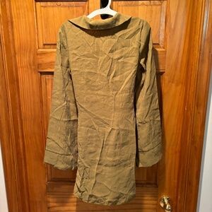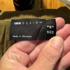 ASOS Design long sleeve tie front dress in olive green. Collared, surplice neckline. Side zipper closure. Women's size 4. New with tags but seem at top of zipper needs to be resewn.