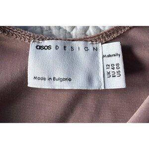 ASOS Design Maternity dress. Dress is done in a dusty pink velvet. It has a faux wrap bodice and a pleated skirt. Dress has half length puff sleeves and a tie that goes under the breast to create more of an empire waist. It's made of a soft poly spandex blend and is a woman's US size 6.
