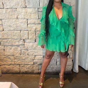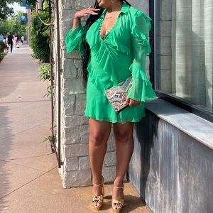 Beautiful green mini dress! Only worn twice. Both occasions shown. Can be dressed up with heels or down with nice sandals! Dress has slip underneath and is NOT see through.