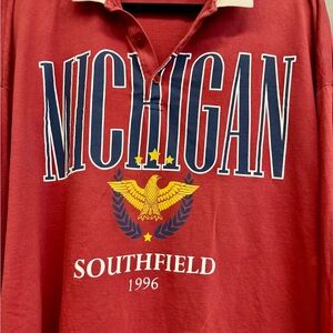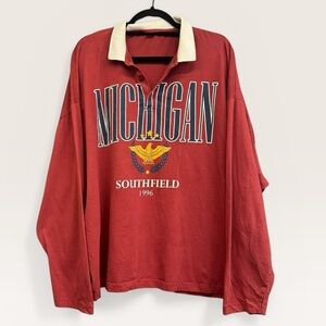 This ASOS Design rugby shirt features a relaxed, oversized silhouette in a deep red colorway. The front boasts a 'Michigan Southfield 1996' collegiate graphic with an eagle emblem, evoking a 90s varsity aesthetic. It features a contrasting off-white collar and a partial button-down placket, blending athletic heritage with contemporary streetwear trends. In excellent condition with a minor flaw: hole on the back collar seam due to the tag being removed.