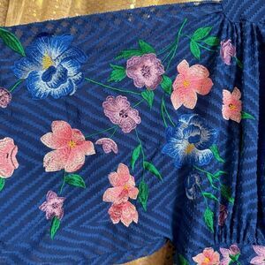 Gorgeous pink, purple, blue and green flower embroidery that pops against the royal blue. Sold out online.