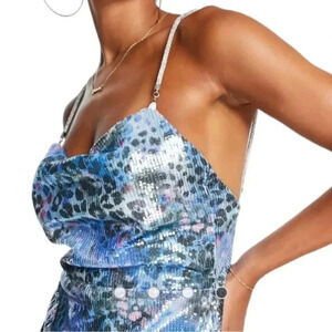ASOS Design Sequin Diamante Strap Cowl Neck Mini Dress blue snake print