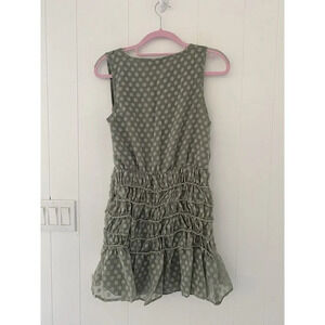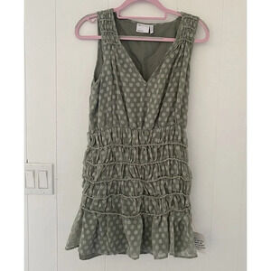 ASOS DESIGN soft sleeveless mini dress with ruched skirt in dobby in khaki sage olive color. Fun ruffled layers. Lined. Side zipper. V-neck. So flattering and flirty and just plain cute.