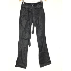 These black coated low-rise flare jeans with a self-tie belt offer a sleek and edgy style perfect for making a statement. Ideal for a night out, concerts, or adding a bold touch to casual outfits.