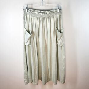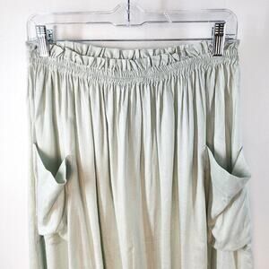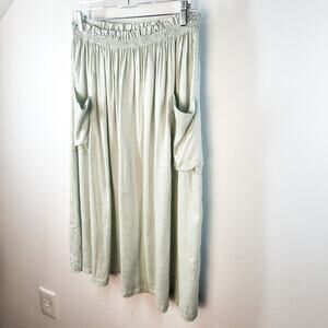 - Description: Light mint green elastic waistband midi flowy skirt with pockets at front