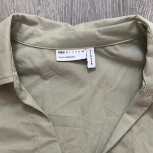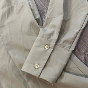 Elegant shirt dress with pleated hem. Perfect for any occasion. Excellent condition. Color is light olive. Ptp 18, length 35.