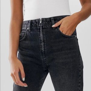 Super cute NWT flare jeans in washed black with zip front. Rather rigid fit. Label says 32/32 but I THINK they’d fit a 28-29 better.