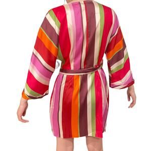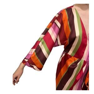 color: 70s striped print, mini dress, kimono style sleeves, tie side
