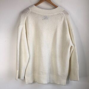 Chunky, soft, cream colored wool blend v neck sweater, with ribbed hem, cuffs and neckline. 3” side slits. Oversized. In excellent condition. Approx 25” from armpit to armpit and 28” from armpit to armpit size 6, but easily fits a large. Please take note of measurements before purchasing.