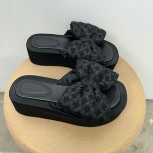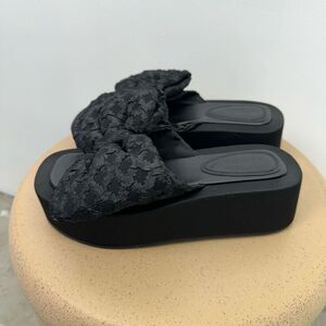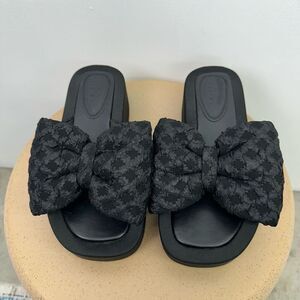 ASOS Design Women’s Teach Black Large Jacquard Bow Flatform Open Toe Mules