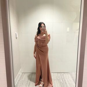 ASOS EDITION satin off-the-shoulder drape wrap maxi dress in cinnamon rose Its the prettiest dress and I only wore it once its in a new condition. ITS SOLD OUT ON THE WEBSITE. Perfect dress for formal or prom or any special occasion. Quality is really good.