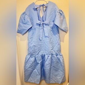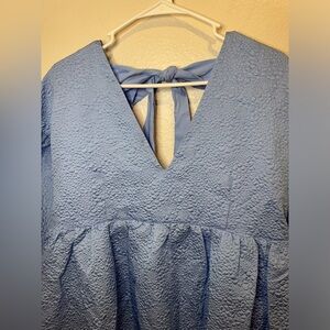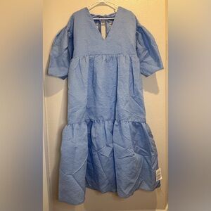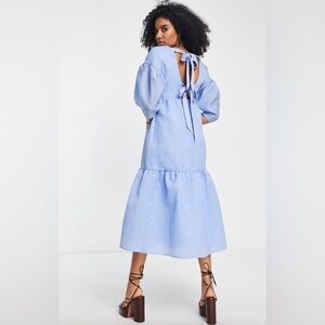 NWT ASOS EDITION Tiered Jacquard Tiered Jacquard Midi with Bow Back in Blue Dress Size 8. New never worn, only pulling, small rip, see the last pic. Not noticeable at this fabric at all.