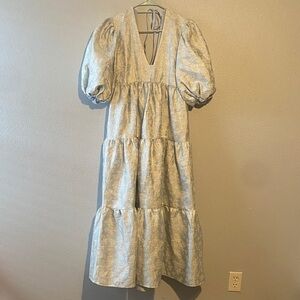 s: It features a V-neck, puff sleeves with elasticated cuffs, side pockets, a tiered hem, and an open back with a tie and zip-back fastening.