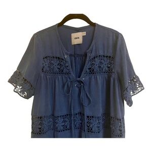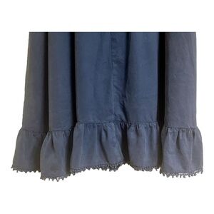 ASOS, EMBROIDERED, BLUE DENIM DRESS. FULL DRESS WITH SHORT SLEEVES. V-NECK WITH LACE UP DENIM STRING. PEASANT STYLE BACK. 4 3/4” RUFFLED BOTTOM. SIZE 10.