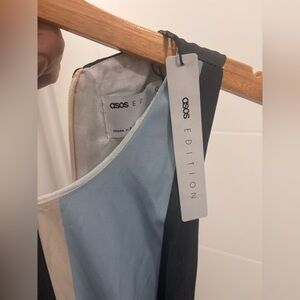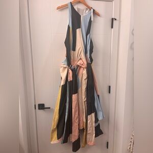 Elegant dress with colorblock design. Features light blue, cream, and dark gray panels. Perfect for a modern look.