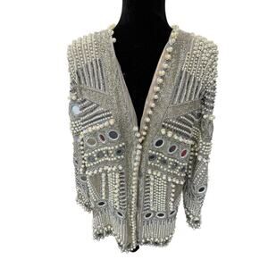 • Details: Open front, long sleeves, fully embroidered with faux pearls, beads, and sequins