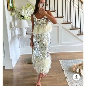 Stunning midi skirt with silver sequins. Tan feather detailing adds elegance. Perfect for special occasions.