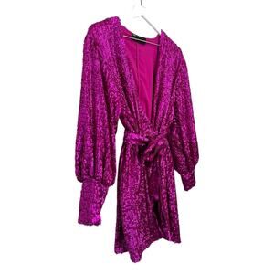 This ASOS Edition sequin mini dress is a bold, eye-catching statement piece perfect for parties, events, or any occasion that calls for sparkle. Designed with a wrap front, tie waist, and voluminous sleeves, it creates a flattering silhouette while offering full movement and comfort. The vibrant hot pink sequins make it a standout dress that photographs beautifully and catches the light from every angle.