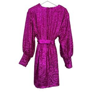 Features: Allover sequins, wrap front, tie waist belt, long balloon sleeves, mini length, fully lined