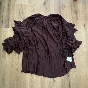 This elegant top features stylish ruffle sleeves, perfect for any occasion. The rich brown color adds a touch of sophistication to your wardrobe. Tunic style.