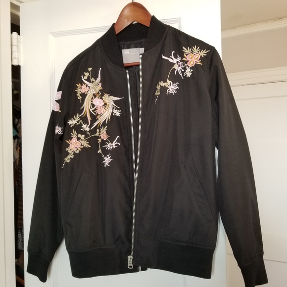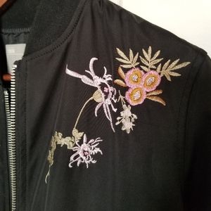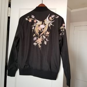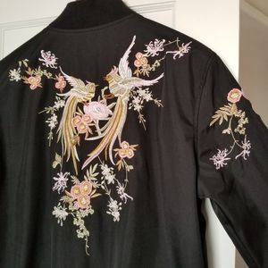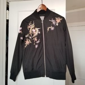 Black zip jacket with pockets and pink embroidery. Beautiful detail and good mid-weight jacket. Zipper is fully functional as seen in last photo. Best fits SM/MD