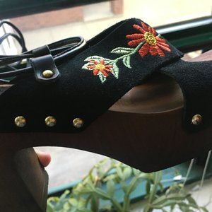 The platform is wood, with a faux leather upper that has beautiful embroidery. The ankle strap (a waxy material - no idea what) could easily be tied in many different ways than I showed in the picture. You could likely replace ankle strap w/ different material/length