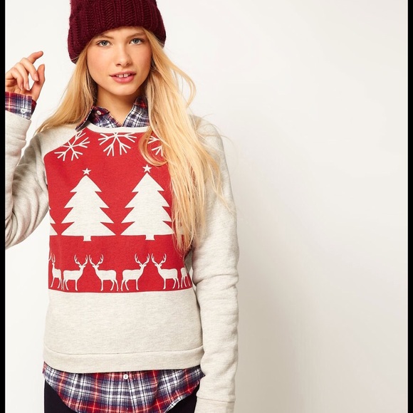 ASOS Fairisle Christmas Pullover Sweatshirt with Reindeer Print. Says Size but is has shrunk a little over time so I would say it is a 2 or xs and it comes a little on the shorter side, please see the model. In gently used condition. wash fading