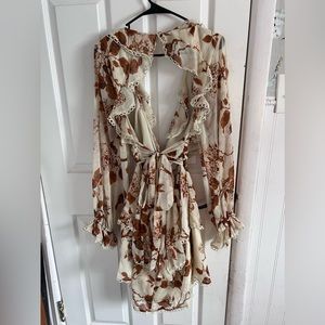 the perfect fall mini dress, has leafy print and eyelet lace trim. there is a small cutout in the front and an open back with a manual bow.