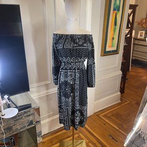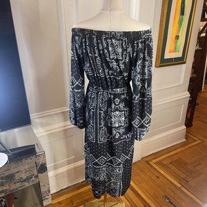 Black and White paisley western print off-shoulder midi dress. SO comfortable with elastic waist band. So cute with cowboy boots and can also be dressed up with heels.