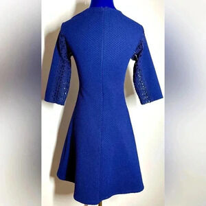 ASOS brand mini dress in navy. Cutout crochet on waist and lower sleeves. No liner, but textured fabric is on the thicker side. Minimal stretch. Women’s size 0