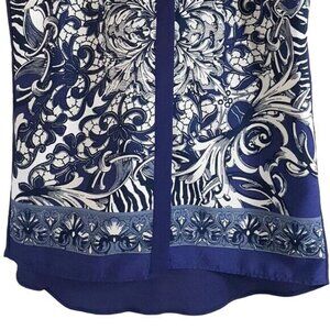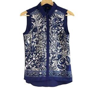 ASOS blue cream scroll sleeveless button up top with slight high low hem. Collar. Solid back. Excellent pre-owned condition with no stains or tears.