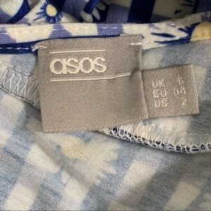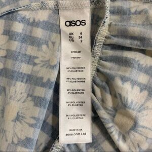 Description: blue and white checkered daisy floral sundress. Has a v neckline, ruffles, and a tie at the neckline