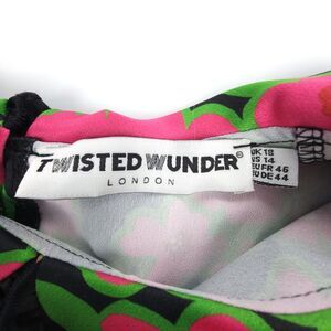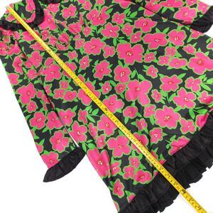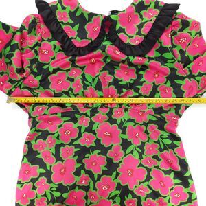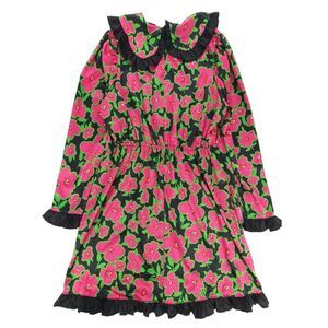 Vibrant floral mini dress by ASOS. Features pink flowers and green leaves. Black ruffle details on collar and hem. Long sleeves.