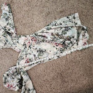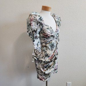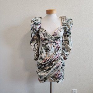 Elegant mini dress with puff sleeves. Features a floral pattern. Perfect for any occasion.