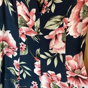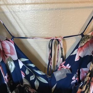 ASOS Floral Off The Shoulder Romper. Navy background with beautiful blush colored floral print in panel design. Can be worn off the shoulder with ruffle straps or on shoulder. Gorgeous adjustable thin strap detail from front to back. Slight V cut on bodice with thin straps threaded through front loops. Has a zipper in the back with a metal clasp closure. Great condition!
