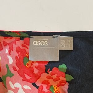ASOS Floral Surplice Top Womens Size 8 Black Pink Blue Lace Trim Peplum Blouse