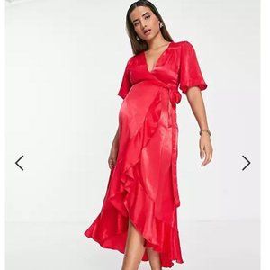 Red Maternity wrap front midi dress with flutter sleeves in satin. Flutter sleeves, ruffle hem, and tie on the side. Brand New - Still in Package, never worn.