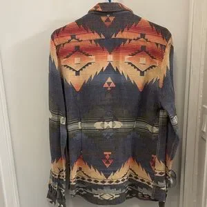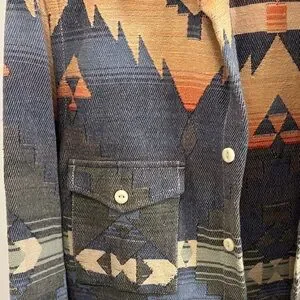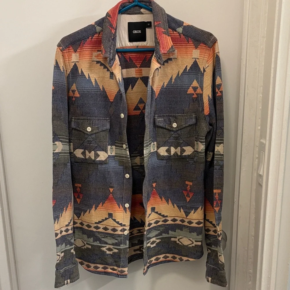 Stylish ASOS jacket with tribal patterns. Features blue, orange, and cream colors. Perfect for casual wear.