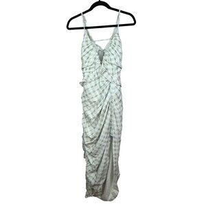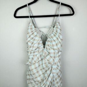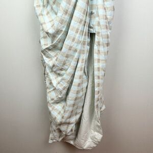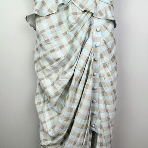 This unique and stunning Asos linen and cotton blend midi to maxi dress is in a checked gingham pattern in shades of aquablue green and tan. Spaghetti strap top that adjusts in the open back with a tie, beautiful button hole type trim around hem at bust, adorable ruffle at the waist, delicate corset like front buttons, and an asymmetrical bottom hem with a side slit. Gathered ruching on sides. Hidden back zipper. Perfect cottage core sun dress for a garden party or other special occasion this summer! Excellent, like new condition. Women's size 8, measurements pictured.