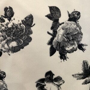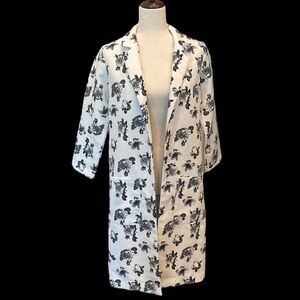 black and white floral, notch collar, front patch pockets, 3/4 length sleeve, back vent, open front- no closures