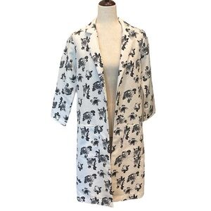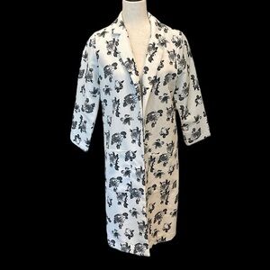 black and white floral, notch collar, front patch pockets, 3/4 length sleeve, back vent, open front- no closures