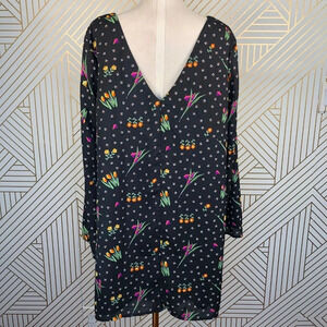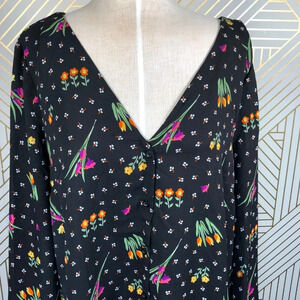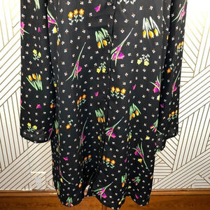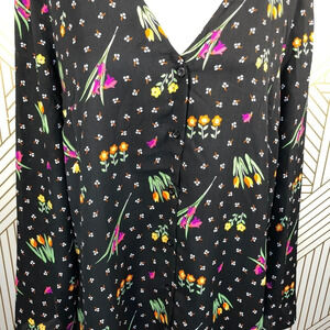 ASOS Glamorous Petite Black Floral Button Dress. Chiffon material dress featuring allover black floral pattern. V-neckline at front and back. Buttons down the front. Bell sleeves. Lined.