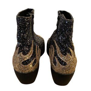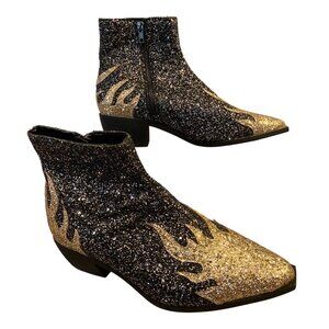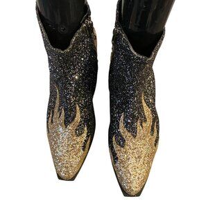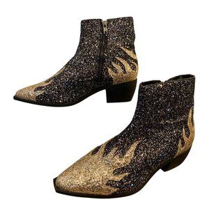ASOS Glitter Flame Ankle Boots Black & Gold Pointed Toe Zipper Closure Size 8