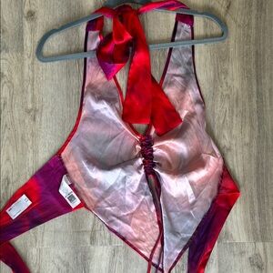 ASOS design halter collared cami top with rushed front in red and purple smudge print.. can be adjusted easily (long ties for behind neck and backk. Like new, only tried on. Size 6
