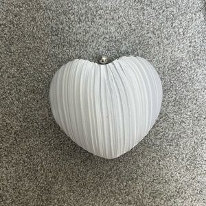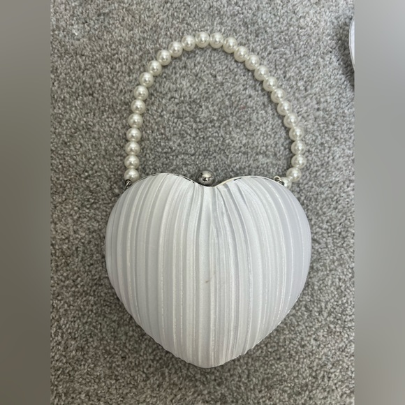 Super cute white satin feel purse with adorable pearl strap. Pearl strap can be removed. I wore this a few times during my wedding week and got so many compliments. May have a few imperfections as it is used. There is one small stain you can see in the picture, but barely noticeable when wearing.