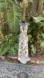 This pretty dress has a deep cut front. It’s like a tulip dress that wraps at the front and is considerably higher by 10 inches to a foot depending in the back then the front. Spaghetti straps. It looks like a halter but it has a eraser back. A pretty orchid and roses floral on a white background in excellent condition. Plenty of stretch.