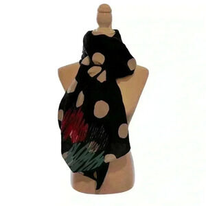 Lightweight, vibrant colors, black with middle size white polka dots, very airy, great for spring or fall
