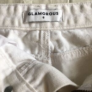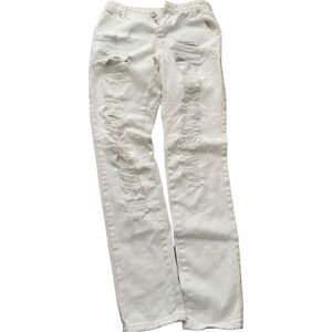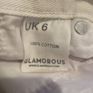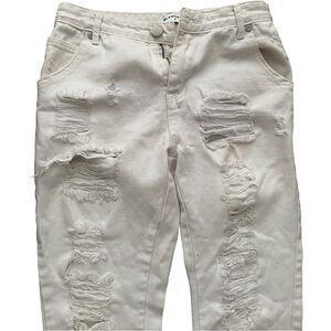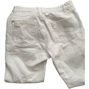 Glamorous distressed denim jeans. High rise. Two pockets. Cute with summer T-shirt or tank top when rolled up. Relaxed fit.