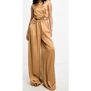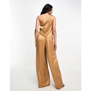 ASOS Design Jumpsuit Satin Drape One Shoulder Gold Hardware Camel Brown NWT 0
