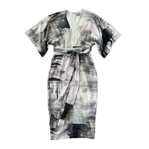 Abstract print. Fully lined. Plunge neck. Wide -cut sleeves. Tied waist with removable belt. Kick split. Slim fit with a narrow cut that sits close to the body. Midi length approximately 45”. Measurements in pictures.